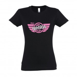 T-krekls ar apdruku. Pieejamie izmēri no S līdz XXL, t-krekla krāsa melna, apdruka luminiscējoši rozā un sudraba. Pēc pieprasījuma iespējams mainīt krāsu apdrukai un t-kreklam.